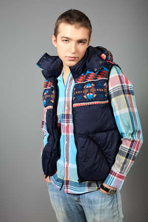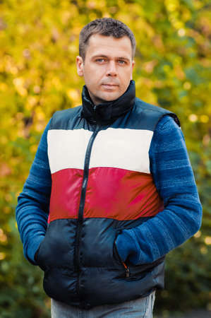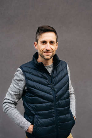 funny handsome guy posing hiding his head in the hood of a warm sleeveless jacket. Cool weather season, horizontal photo for advertising mockup