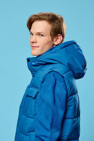 Blue youth stylish demi-season down jacket jacket and hat. White wood floor.