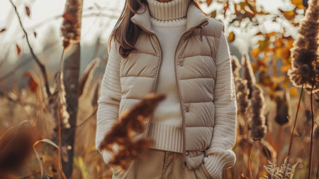 Stylish Young Woman in a Vest and Sweater Amidst Autumn Foliage at Sunset