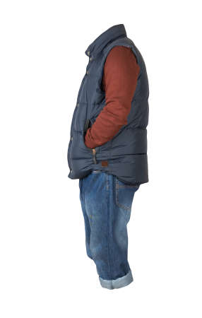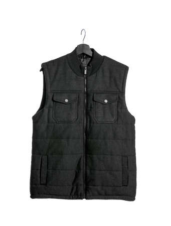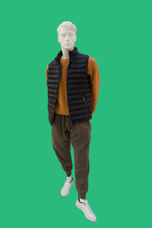 Full length image of a male display mannequin wearing black quilted vest isolated on a green background