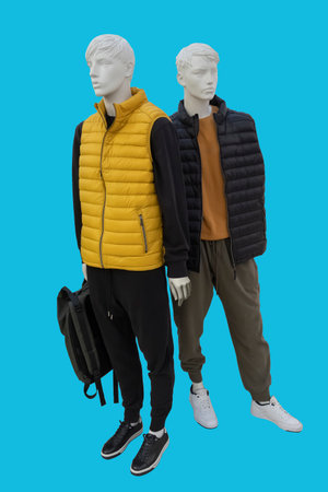Two full length images of a male display mannequins wearing fashionable clothes isolated on blue background