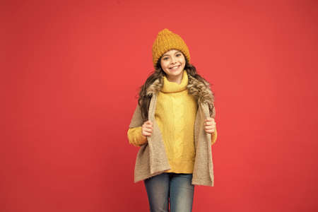 Posing for photo. happy teen girl wear warm winter clothes. childhood happiness. winter holiday activity. child in knitted hat and scarf feel cozy. wearing comfortable apparel in cold season