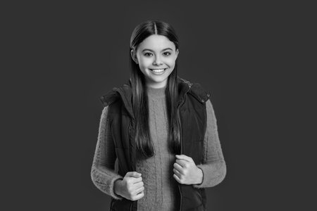 Winter sports. teen child in puffer waistcoat and knitwear. seasonal kid fashion. christmas holiday and vacation. cute beauty keep warm. weather forecast. cheerful girl ready for winter activity