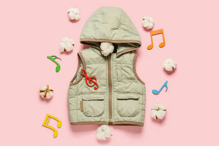 Baby autumn wear clothes on yellow background. Top view. Overhead view of warm kid autumn clothes on colored backdrop