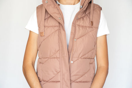 A girl in a white T-shirt and a pink warm vest stands on a white background, fashionable warm women's clothing, autumn vest, women's clothing