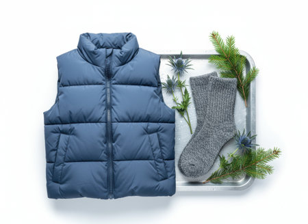 Navy blue puffer vest and warm wool socks arranged with winter greenery and pine sprigs on a silver tray for seasonal comfort.