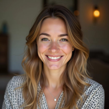 A young woman with blonde hair smiling warmly, wearing a striped shirt, soft lighting creating a cozy atmosphere