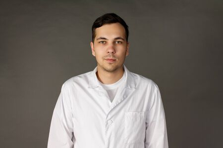 Portrait of a doctor in a medical gown and protective mask. Photo on a grey background