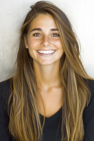 A smiling Caucasian young beautiful woman from France, embodying warmth and joy. Her relaxed demeanor and carefree expression convey a sense of happiness and approachability. Generative AI.