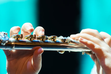 Flute playing flutist musician performer with bright musical instrument