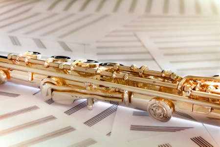 A detail of a flute resting on a sheet of music score