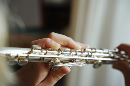 Hands skillfully play a flute, focusing on finger placement and technique. The image captures the artistry and precision required in playing this musical instrument.