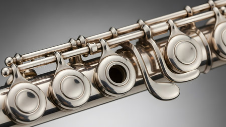 A close-up shot of a silver flute, showcasing its intricate details and polished finish.