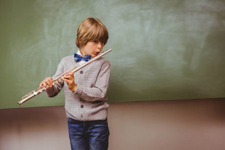 School boy playing silver flute before green chalkboard wearing cardigan, copy space. Music, education, performance, youth, creativity, classroom, artistic