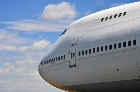 Close-up and high-view shot with beautiful blue sky background of airplane's head part which has been used for flight service for long time showing water stain and rust on the metal surface.