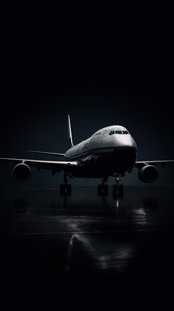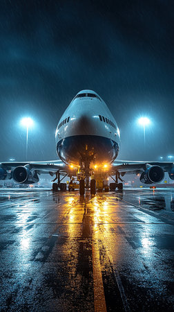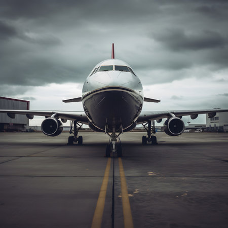 A large jetliner is positioned on the airport runway under dense, cloudy skies. the aircraft's front view highlights its powerful jet engines and sleek design, illustrating themes of aviation, travel, and weather conditions.