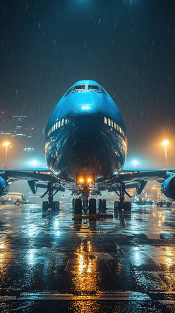 A majestic Boeing 747 is parked at the airport during a rainy night with lights glowing.