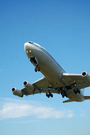 Vienna, Austria - April 4, 2020: Airplane on landing approach on a sunny day in spring, blue sky, sunny day in spring
