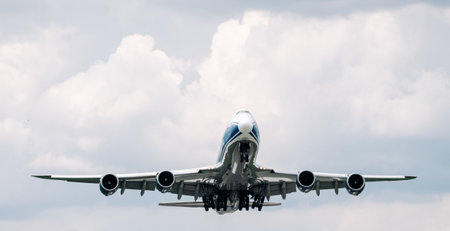 July 13, 2019 Moscow, Russia. An AirBridgeCargo Boeing 747 cargo plane comes in for landing at Sheremetyevo International Airport on a cloudy day.