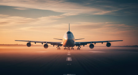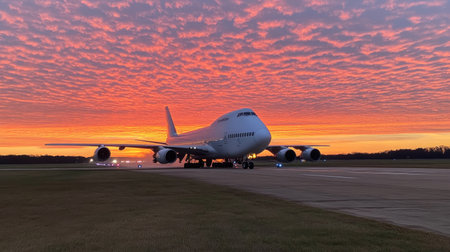 A stunning airplane sits on a runway at sunrise, bathed in vibrant colors from the sky. This captivating scene captures the essence of aviation and beauty in nature.