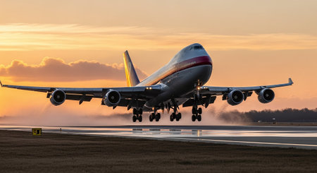 Airplane taking off from runway at sunset, Moscow, Russia.