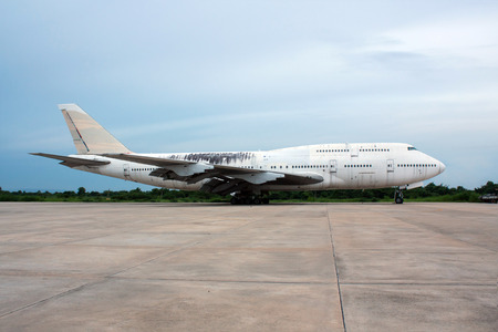 Nakhon Pathom, Thailand - June, 09, 2020 : The old commercial aircraft was discharged with a stormy sky at Nakhon Pathom, Thailand