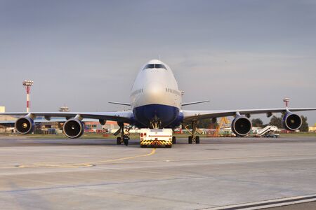 MOSCOW, RUSSIA - SEPTEMBER 26, 2014: Boeing 747 Transaero towed to the runway. Transaero Airlines has ceased to exist in 2015.