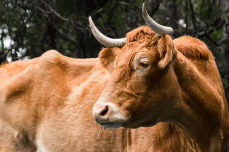Closeup portrait of a cute friendly cow on a summer evening on a village countryside
