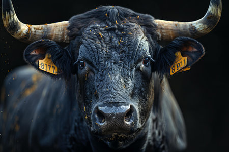 A bull with large horns is standing in a pen. The bull has a yellow tag on its ear