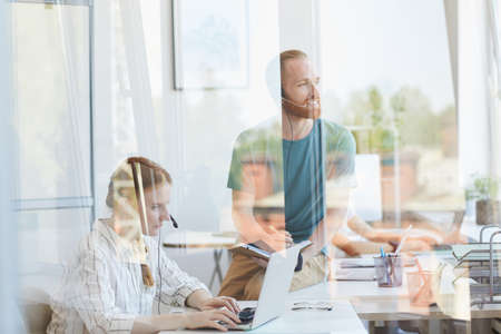 Group of office workers working together at office behind the glass wall