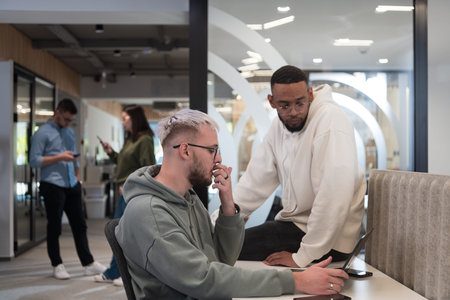 International multicultural business team.A young business man and woman sit in a modern relaxation space and talk about a new business.