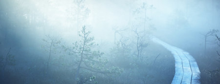 Wooden pathway through the evergreen forest in a thick mysterious fog at sunrise. Latvia. Soft sunlight. Idyllic autumn landscape. Natural tunnel, fairy, dreamy scene. Nordic walking, ecotourism theme