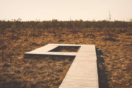 Empty sad pathway in swamp forest national park in brown yellow autumn fall colors landscape background wallpaper. Photo processing in retro vintage faded hipster style. Post-apocalypse scene view.