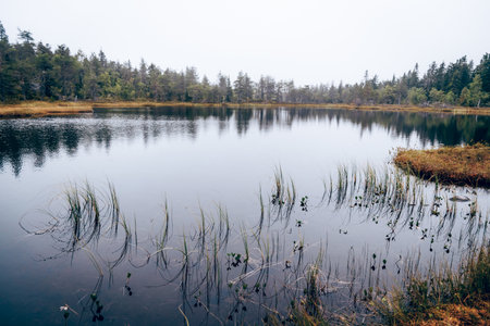 Rainy and gloomy day in the bog, traditional bog landscape with wet trees, grass and bog moss, foggy and rainy background, autumn