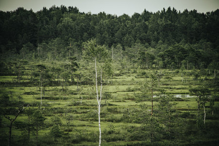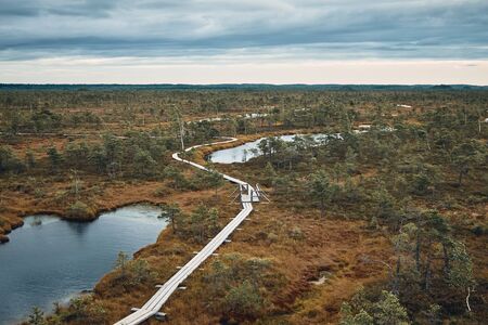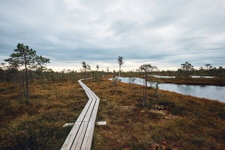 Swamp at gloomy weather in Latvia. Apocalyptic feeling hiking on a wooden trail through the bog with dark clouds. Swamp is surrounded with small lakes, junipers, plants and wildlife.