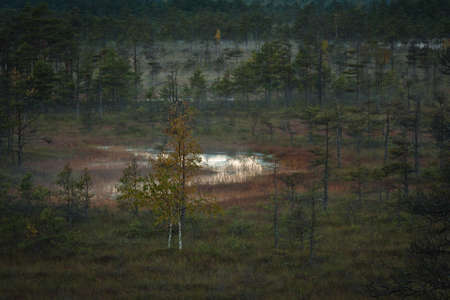 misty mire landscape with swamp pines and traditional mire vegetation, fuzzy background, fog in bog, twilight, Dikli, Madiesenu mire, Latvia