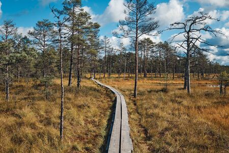 A wooden path in the National Park in Estonia among the forest and bog on a clear day