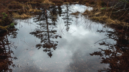 Overcast skies reflecting on the murky brown waters of the bog