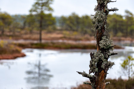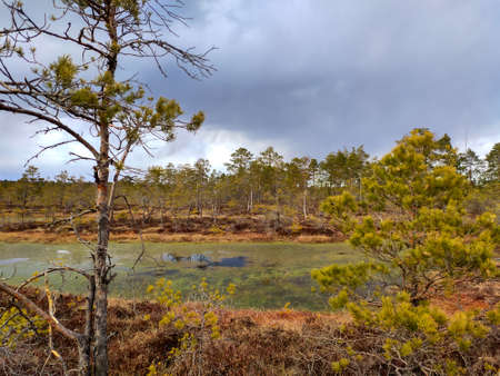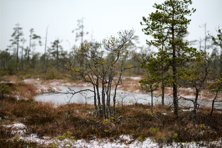 bog landscape, bog vegetation painted in autumn, small swamp lakes, islands overgrown with small bog pines, grass, moss cover the ground, Kemeri National Park, Latvia