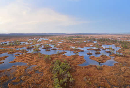Swamp Yelnya in autumn landscape. Wild mire of Belarus. East European swamps and Peat Bogs. Ecological reserve in wildlife. Marshland at wild nature. Swampy land and wetland, marsh, bog.