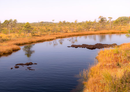 Crystal clear lake (bog) at sunrise. Pine trees, plants, heather flowers. Clear blue sky, symmetry reflections on water. Autumn. Kemeri national park, Latvia. Pure nature, ecotourism, hiking