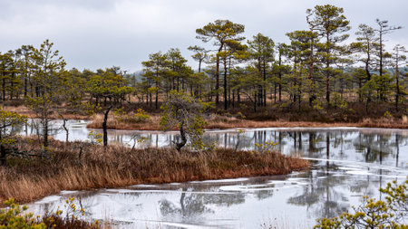 winter landscape of a swamp without snow, pond covered with ice, reflections, swamp vegetation in winter, pine trees, old grass, moss, winter
