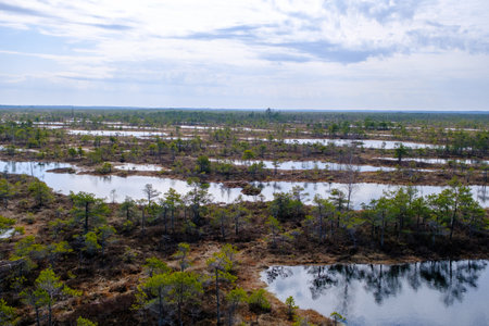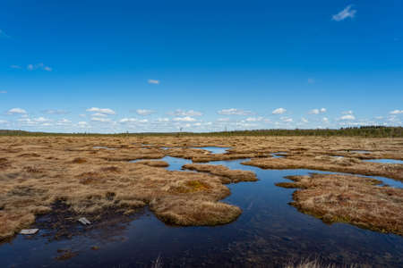 Spring landscape in the swamp. small swamp lakes, mosses and pines. small islands of swamp water. Spring Mars Landscape. Small Lake with Swamp Islands.