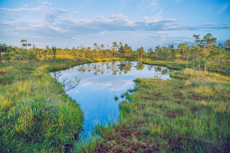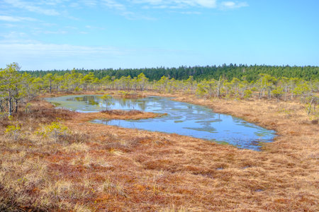 traditional peat bog landscape, bog vegetation painted in autumn, grass, moss covers the ground, Latvian bog