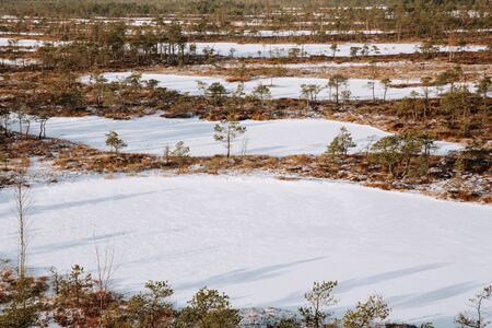 Rural winter scenery. Swamp with frozen water and pine tree at sunny day.