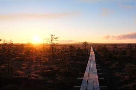 a wooden footbridge leads through the bog, colors typical of autumn in nature, bog plants painted in brown tones, rare swamp pines, autumn in the bog