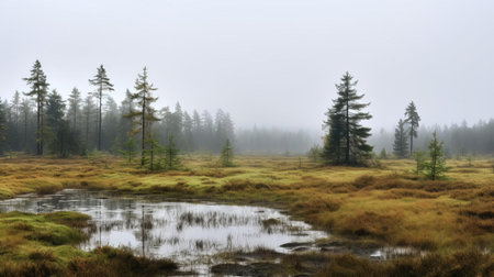 the fen, surrounded by a mix of deciduous trees and towering firs, stands serene amidst the misty veil of rainy weather, with the tops of the trees peeking out from the fog, creating a mystical atmosphere in this serene and peaceful landscape scene. ai generated