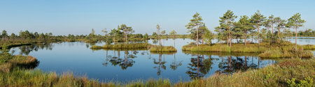 bog landscape, spring-colored bog vegetation, small bog lakes, islands covered with small bog pines, grass, moss, peat islands in a large basin system