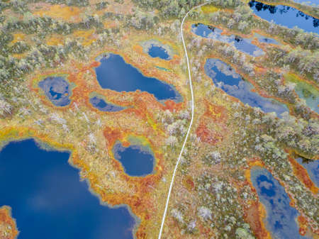 Wooden hiking trails in swamps or bog in Estonia. Drone aerial view