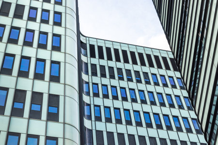 Abstract architecture with geometric patterns and blue window panes. Modern office building design reaching towards the sky. Urban skyline.